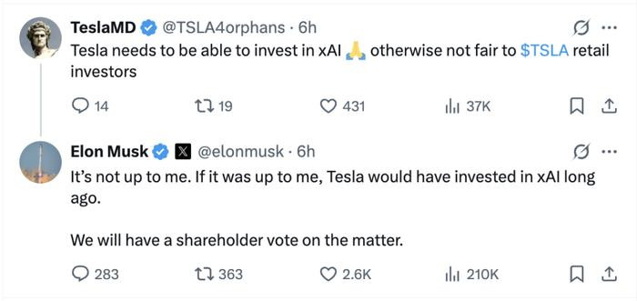 当地时间14日一早,又有网友在X上询问特斯拉股东是否会支持特斯拉与xAI合并,马斯克对此回应“不会”。